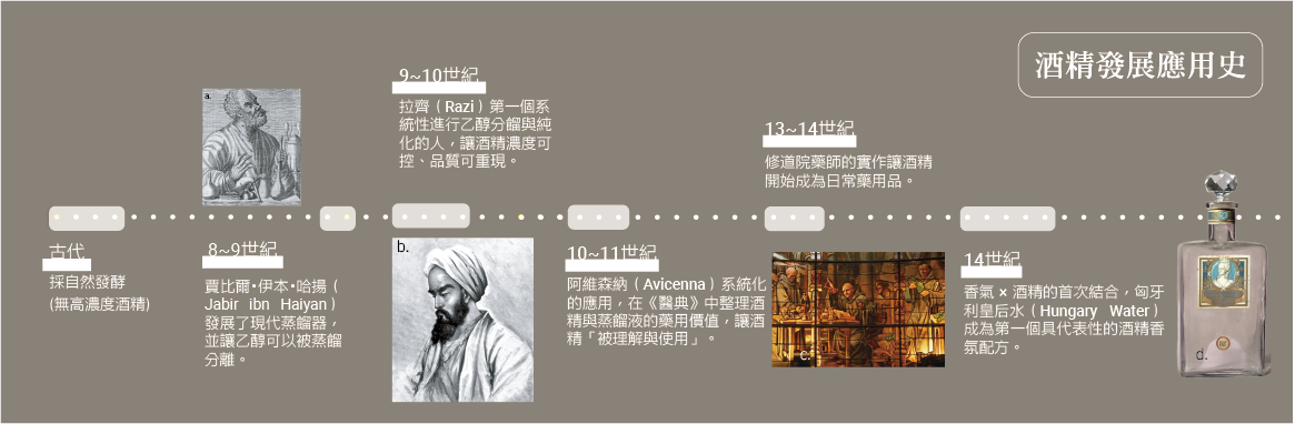 至此之後,在中古歐洲的修道院裡,僧侶們開始以蒸餾器製作藥酒與草本酒精萃取物。這些原本為醫療而生的調製物,卻意外展現出更清澈、乾淨且具穿透感的香氣表現「酒精作為香氣溶劑的時代在此悄然展開」。