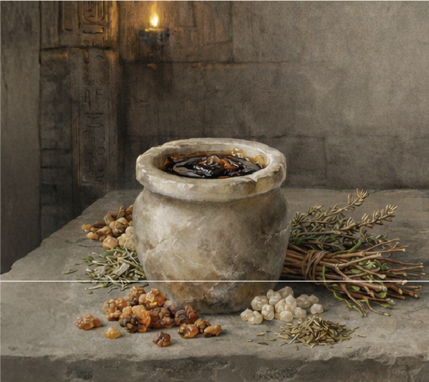 「奇斐」並非單一香料,而是一種結合樹脂、草藥、香料、葡萄酒、蜂蜜與乾果的芳香製劑,擁有宗教、醫療與日常三重用途。它既用於神殿晚禮拜的焚香儀式,也可溶於酒中作為藥酒,甚至能研磨成膏狀成為外用敷料,是世界最早的「香氣處方」之一。